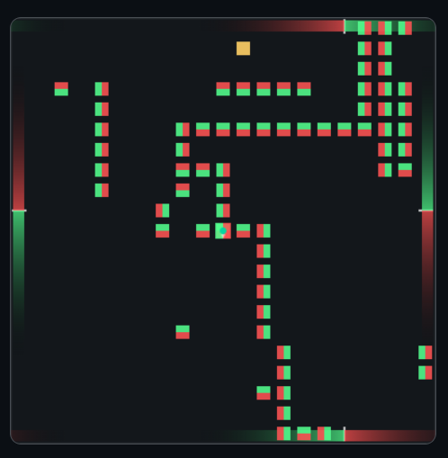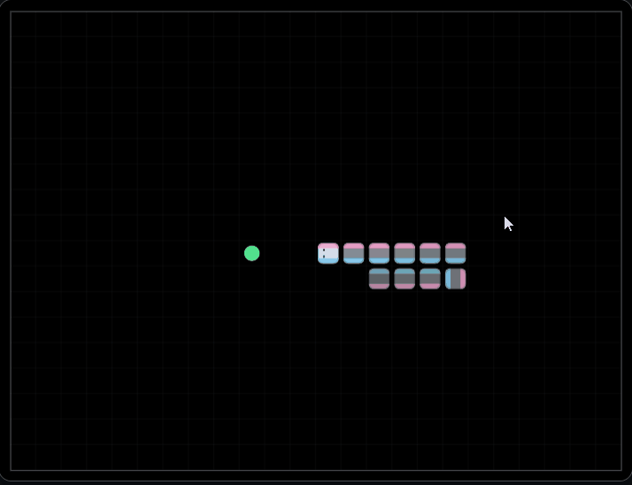 This gave me the idea to create a game of snake played on a Klein bottle. Snake games often “glue” the sides together so that you portal through left to right and top to bottom, creating a torus topology. But what if we take one of those portals and add a twist? Then as you go through the left portal near the top, you come out the right side near the bottom, reflected. If we introduce “reflection portals” like this with no portals on the top/bottom, we would be playing on a mobius strip.